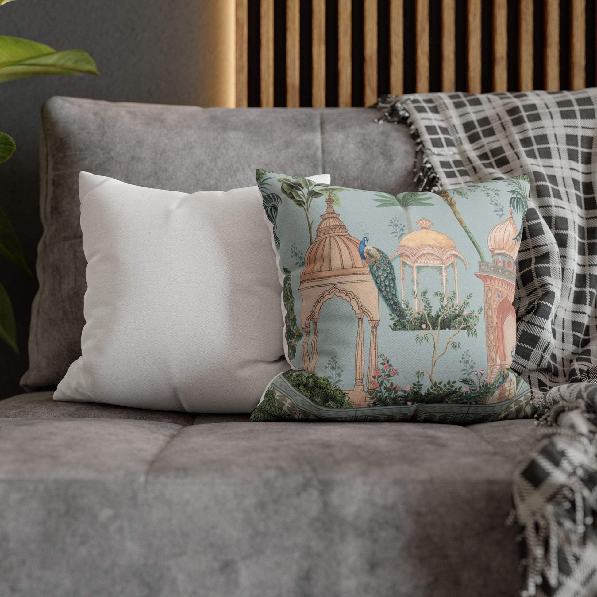 Infuse your space with royal elegance using the Peacock Mahal Cushion Covers by Lushlyf. Featuring serene blue tones and intricate domed architecture with majestic peacocks, this 16x16-inch cover in glossy taffeta silk brings a heritage-inspired festive charm to your home