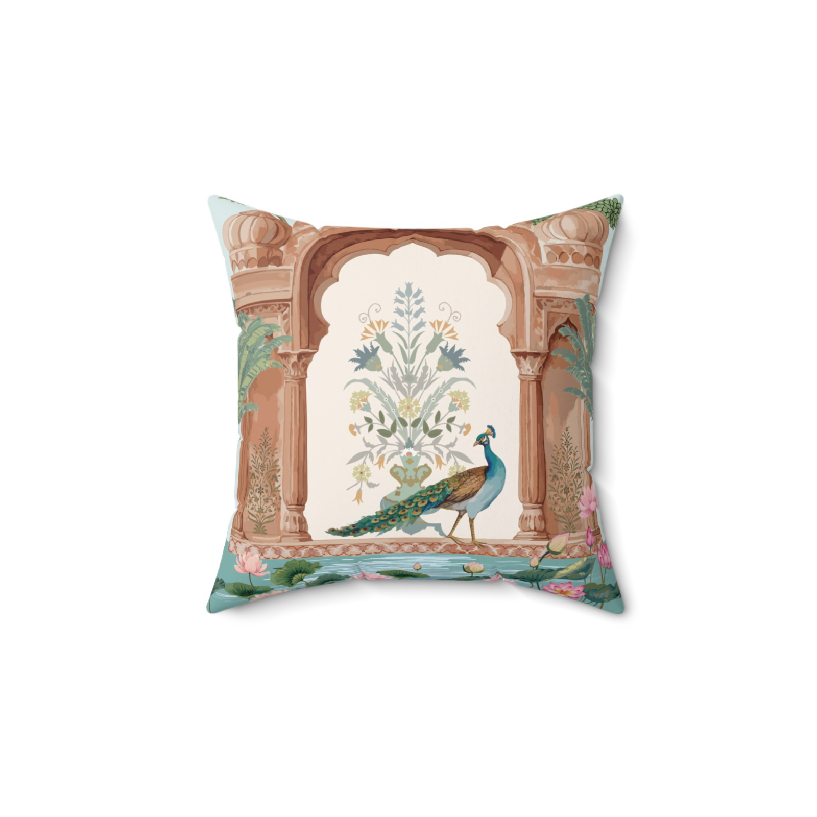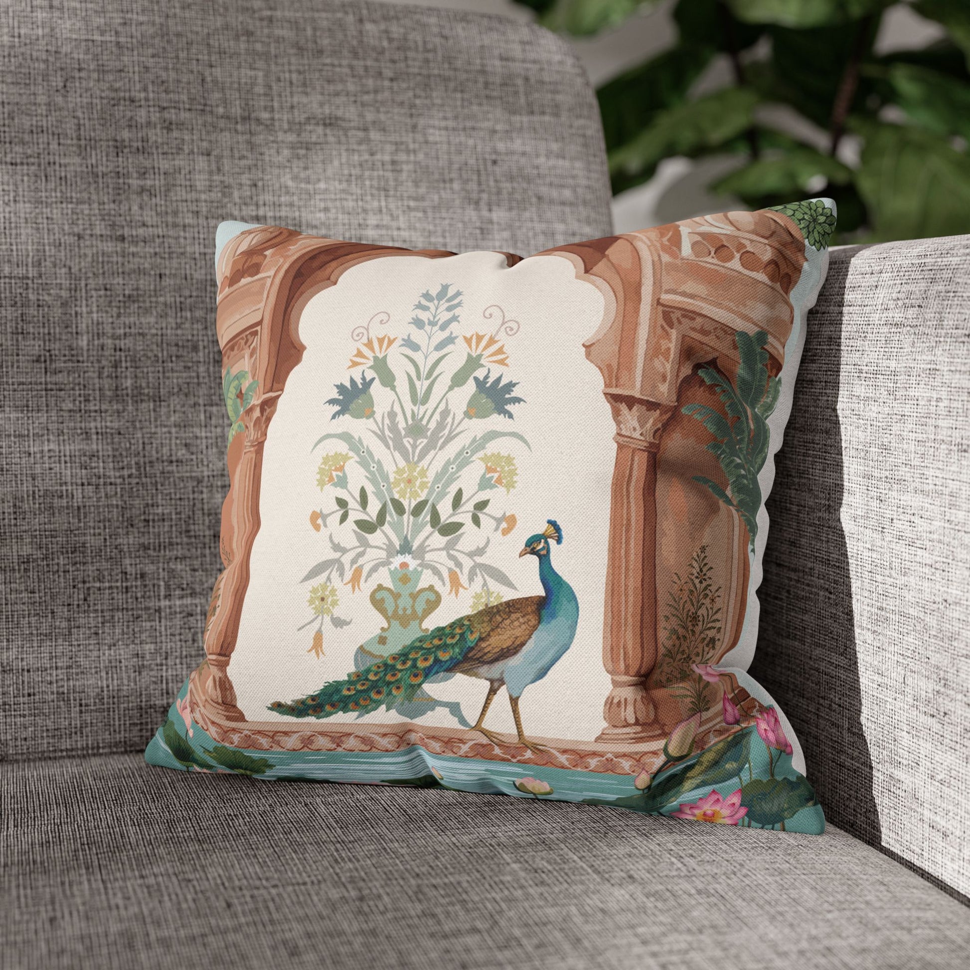 Add a regal touch to your home with the Royal Mayura Arch Cushion Covers by Lushlyf This 16x16-inch taffeta silk cushion features a majestic peacock framed by a classical arch and floral detailing—perfect for festive and heritage-inspired decor